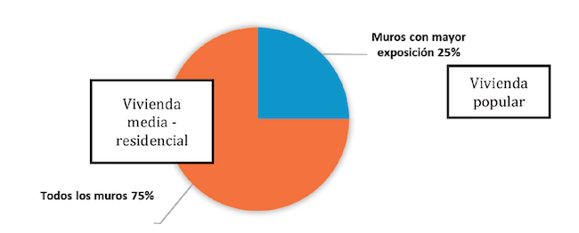 En la gráfica 4 puede apreciarse que en la vivienda popular prevalece el criterio de colocar aislamiento térmico únicamente en los muros de mayor exposición al sol, mientras que en la vivienda media y residencial se aíslan todos los muros; esto se suma al hecho de que estas viviendas están construidas con ladrillo de arcilla o puzolánicos, se reduce aún más la transferencia de calor al interior de la vivienda, por lo que el consumo en energía eléctrica es proporcionalmente menor que en la vivienda popular; sin embargo, también debe considerarse que la vivienda popular requiere menos energía para su climatización, debido a que son viviendas de menor tamaño.