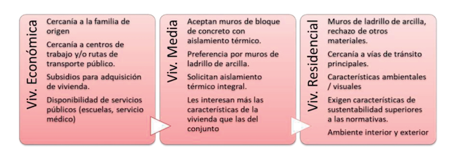 Para los compradores de vivienda económica y popular, uno de los criterios de selección más importantes es que se encuentre cerca de la vivienda de su familia de origen y de los centros de trabajo, o que exista transporte público cercano, por la necesidad que tienen de dejar a sus hijos encargados con su familia mientras están trabajando. Debido a su baja capacidad de compra, necesitan acceder a subsidios para la adquisición de la vivienda, aceptan que la vivienda se encuentre en zonas menos privilegiadas de la ciudad siempre y cuando existan rutas de transporte público, y aceptan también que la casa esté construida con bloques de concreto, aunque solo tengan aislamiento térmico los muros de mayor exposición. Por lo general, les interesan más las características mencionadas que la sustentabilidad de la vivienda.