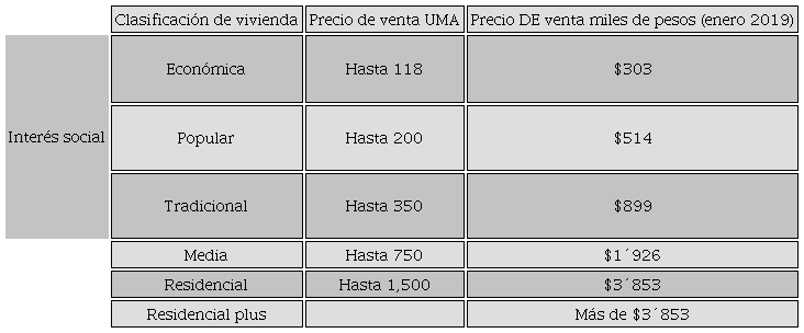 Las categorías económica, popular y tradicional forman el conjunto de vivienda conocida como “de interés social”, y los compradores en estos segmentos de mercado pueden acceder a beneficios como subsidios y apoyos para la adquisición de vivienda. La categoría popular, a su vez, se divide en tres segmentos: hasta 128 unidades de medida y actualización (UMA), hasta 158 UMA y hasta 200 UMA. Debe notarse que esta categorización obedece únicamente al precio de venta, sin tomar en cuenta características cualitativas de la vivienda, como las dimensiones, la comodidad de los espacios o los materiales de construcción utilizados.