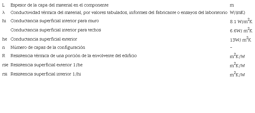 Para obtener la resistencia total se realiza la suma de las resistencias parciales (rse+R1+R2+Rn…+rse), considerando que la resistencia de la superficie exterior (rse = 1/he) he=13 W/m2K y la resistencia de la superficie interior (rsi=1/hi), el valor de hi para muro es de 8.1 W/ m2K, y para techo es de 6.6 W/m2K, según sea el caso. Después se identifica la conductividad térmica del material y el espesor en el “n” número de capas que conforman el sistema, para obtener la resistencia parcial de cada capa (Ln/. λn). El proceso utiliza un modelo físico unidimensional de carácter estacionario (ONNCCE, 2009).