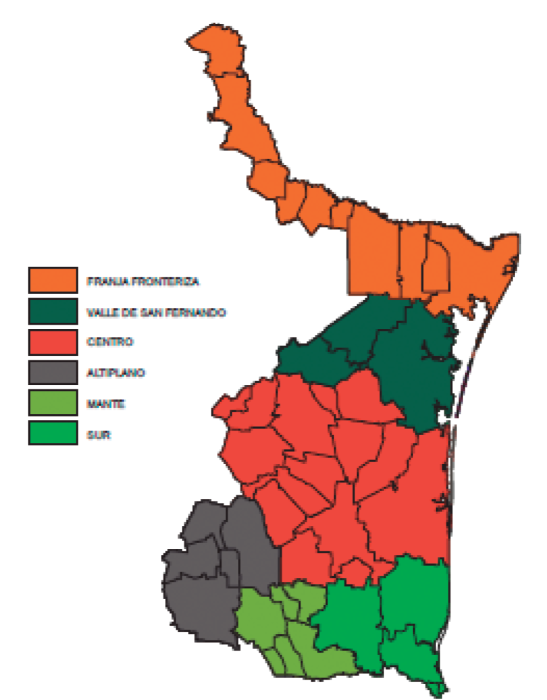 De acuerdo con la Dirección de Ordenamiento Territorial del Estado de Tamaulipas, son seis las regiones políticas que conforman el estado (imagen 1). La llamada región Franja Fronteriza cuenta con una extensión territorial de 16,841,934 km2, y está formada por diez municipios; la región Sur tiene cinco municipios; la región Centro está formada por trece municipios; la región Mante tiene seis municipios; la región Valle de San Fernando está conformada por cuatro municipios, y la región del Altiplano está conformada por cinco municipios (SEDUMA, 2015) (tabla 3).