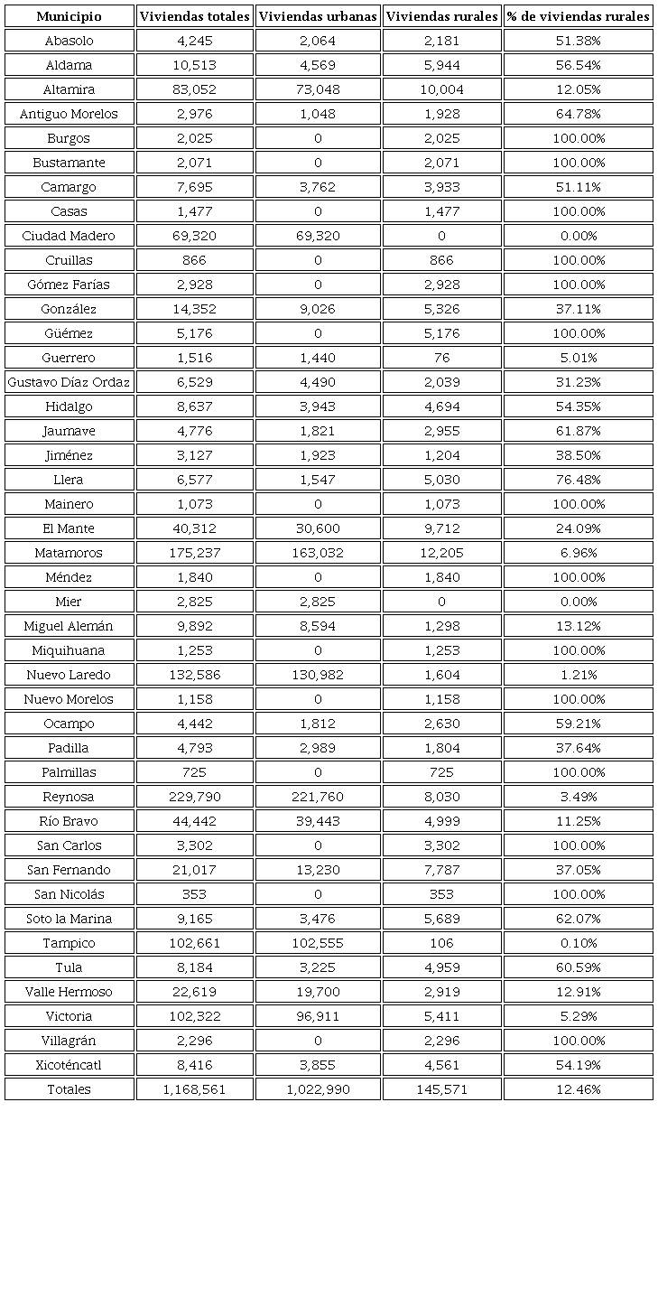 Con respecto a la vivienda, en Tamaulipas se tiene 1,168,561 viviendas distribuidas en los 43 municipios del estado; 145,571, (12 %) de estas se encuentran en localidades rurales; se observan los datos en la tabla 5.