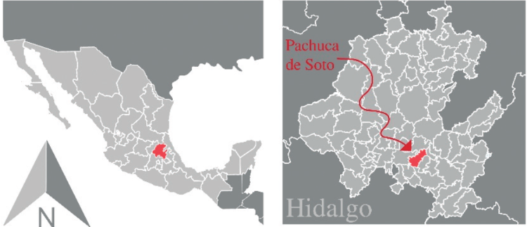 La ciudad de Pachuca de Soto se localiza en las coordenadas geográficas 20° 07’ 18” de latitud norte y 98° 44’ 09” de longitud oeste; tiene una altitud que oscila entre 2,382 y 2,400 metros sobre el nivel del mar (INEGI, 2015a). Su clima es templado subhúmedo y tiene una población de 256,584 habitantes (figura 1). Su evaporación promedio anual es de 863.6 mm, su precipitación promedio anual es de 581 mm y el periodo de lluvias comprende de abril a octubre (SMN, 2018).