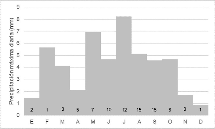 Para determinar el volumen de agua de lluvia cosechable en la azotea de la vivienda se tomó en cuenta el registro histórico (1991-2014) de precipitación diaria en la estación climatológica de la ciudad (clave CONAGUA 013056). De este registro, se seleccionaron todos los días con precipitaciones superiores a 1 mm (n= 82 días). A continuación, se seleccionó la serie de datos para establecer los máximos diarios mensuales. Su estadística descriptiva es la siguiente: σ= 0.79050171, media= 4.17, mediana= 6.03 y rango= 7.36. Enseguida, se construyó el hietograma de precipitaciones para determinar los parámetros de cálculo (figura 2).