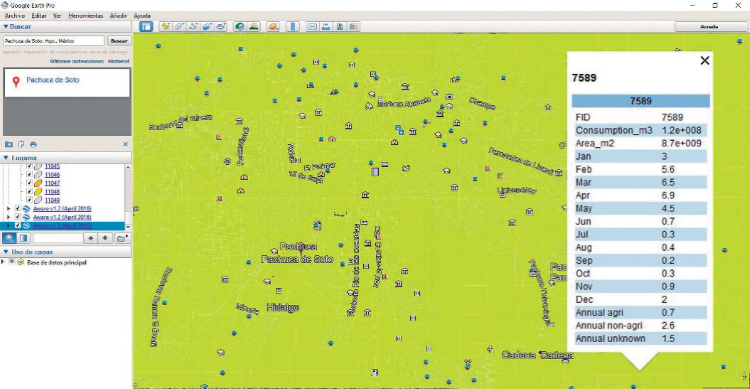 El indicador AWARE Annual AGRI mide la escasez de agua o su disponibilidad en una región geográfica (PNUMA SETAC, 2004). Este se obtuvo a partir de una base de datos (AWARE Agri, versión 1.2, 2016) y se instaló en Google Earth, desde donde se seleccionó la región donde se realizó el análisis. Para este estudio, se seleccionó el AWARE Annual AGRI para Pachuca de Soto (figura 3).