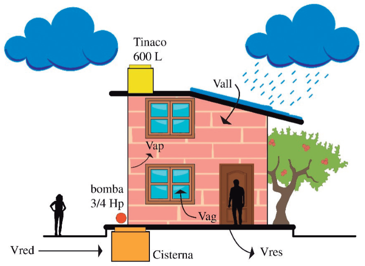 Se establecieron dos escenarios: 1) Consumo de agua en la vivienda, donde el volumen de agua potable proviene de la red pública de abastecimiento (Vred); el volumen de agua potable que se consume sin medidas de conservación (Vap); el volumen de agua no disponible o que se descarga sin ser reutilizado, como agua residual (Vres) y 2) Incorporación de un volumen de agua de lluvia cosechada en la azotea para usos no potables (Vall); reúso de agua gris recuperada en el interior de la vivienda para fines no potables (Vag); reúso de agua gris a través del riego de jardín (Vinf); volumen de agua potable reducido al incorporar los volúmenes antes citados (Vap); volumen de agua residual disminuido al reusar agua gris para un segundo uso y limitar el volumen de agua de lluvia que anteriormente descargaba hacia el drenaje (Vres) (figura 4).