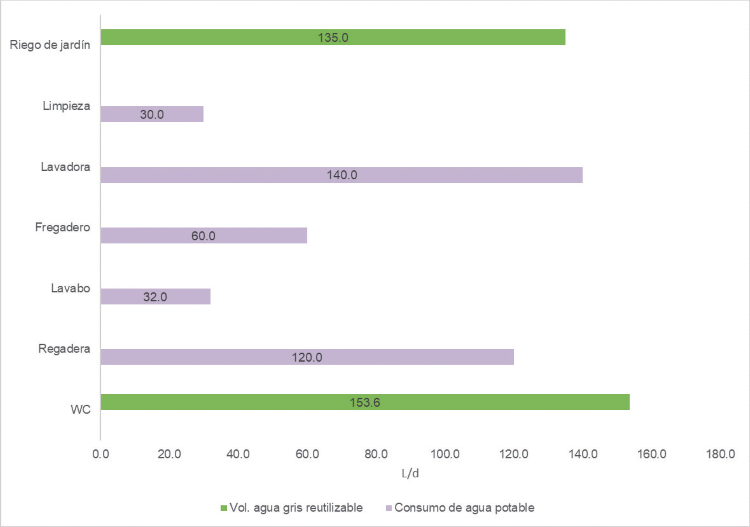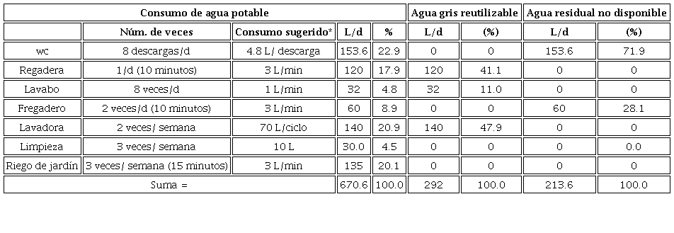 En el cuadro anterior se observa que el agua que se consume en el WC es agua residual no disponible (no reusable), debido a que requiere tratamiento para su recuperación; el agua consumida en el fregadero también es un volumen no disponible, debido a su contenido de grasas; mientras que el agua utilizada para limpieza se dispone como parte del agua para el riego de jardín (infiltración al subsuelo). Los volúmenes de agua gris provenientes de las regaderas, lavabos y lavadora se consideran agua gris reusable para fines no potables, siempre y cuando se renueven diariamente (Fane y Reardon, 2013).