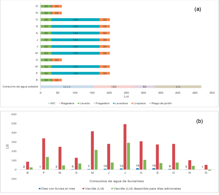 Al menos parcialmente, durante los meses de lluvia es posible utilizar el agua cosechada para los usos propuestos y aún es posible almacenar un volumen adicional para días posteriores: mayo (siete días, volumen adicional = 213.88 L), junio (diez días, volumen adicional = 77.80 L), julio (doce días, volumen adicional = 291.94 L), agosto (quince días, volumen adicional = 105.75 L), septiembre (quince días, volumen adicional = 71.80 L) y octubre (ocho días, volumen adicional = 77.87 L). Durante los meses que corresponden al periodo seco del año, aunque se pueden almacenar volúmenes suficientes para fines limitados (lavabos y limpieza), solamente son volúmenes disponibles para un día (febrero), dos días (enero), tres días (marzo y noviembre) y cinco días (abril), mientras que durante el mes de diciembre no se cosecharía agua de lluvia (figuras 6a y b). Esta medida representa un ahorro adicional equivalente al 30.12% en el consumo de agua potable en la vivienda, ya que, durante esos días, únicamente se utilizaría para regadera y cocina (el consumo en WC y jardín se cubre con agua gris).