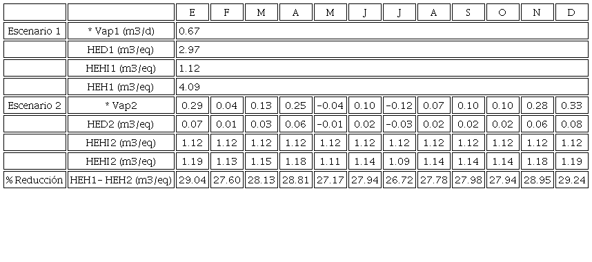 Con respecto a la huella hídrica total (HEH2) esta logró reducirse de 4.09 m3 eq. en el escenario 1 hasta 1.09 m3 eq. (mes de julio) y 1.19 m3 eq. (meses de diciembre y enero), para el escenario 2. Esto se debe a que durante el mes de julio se tienen las precipitaciones diarias más elevadas del año (8 mm/d), lo que representa un potencial de captación de agua de lluvia mayor que en el resto de los meses. También se aprecia una disminución importante en la HEH durante los meses más secos, debido al uso combinado con el volumen de agua gris, que ayuda a reducir la presión hídrica en la vivienda de forma importante. La huella de escasez hídrica indirecta (HEHI) se mantiene constante en ambos escenarios a través del tiempo. Esto se debe a que la operación de la bomba para abastecer el consumo de la vivienda no cambia, solo el origen del agua consumida. No es posible mitigar este último impacto a través de la huella hídrica indirecta en esta propuesta, ya que sería necesario independizar al usuario del empleo de la bomba para la alimentación de su tinaco.