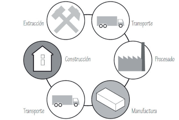 La “energía incorporada” y las emisiones de CO2 a la atmósfera, durante la extracción de materias primas, los procesos de transformación y el transporte de los materiales hasta su destino final de utilización son parte fundamental de la valoración de su ciclo de vida (Rocha, 2011). En la figura 2 se muestra un esquema que integra las distintas fases del ciclo de vida de un material: extracción, transporte, procesado, manufactura, transporte y construcción.