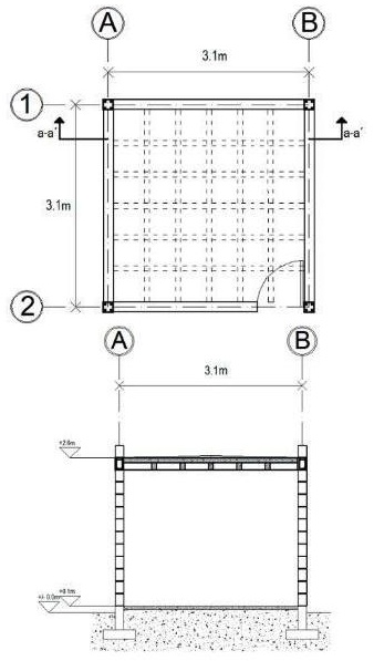 a) cimientos continuos de concreto armado, con base de 0.55 m x 0.15 m y contratrabe de 0.55 m x 0.15 m; b) columnas de concreto armado, con sección de 0.15 m x 0.15 m; c) vigas de concreto armado, con sección de 0.2 m x 0.15 m; d) piso de concreto armado, con espesor de 0.05 m; e) muros de block hueco de concreto, con dimensiones de 0.4 m x 0.2 m x 0.15 m; f) cubierta reticular de concreto armado, con viguetas de 0.12 m x 0.08 m, capa de compresión de 0.05 m de espesor, placas de poliestireno de 0.4 m x 0.4 m x 0.1 m. En la Figura 4 se observan las características espaciales y constructivas del sistema convencional.