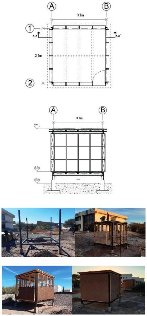 a) cimientos aislados de concreto armado, con base de 0.8 m x 0.8 m x 0.15 m y dado de 0.2 m x 0.2 m x 0.65 m; b) columnas de acero tipo PTR, con sección de 0.1 m x 0.1 m y calibre de 0.0019 m; c) vigas de acero tipo PTR, con secciones de 0.1 m x 0.1 m y calibre de 0.0019 m; d) piso con entramado de madera, con secciones de 0.1 m x 0.1 m para envigado y secciones de 0.3 m x 0.025 m colocadas sobre el envigado, para soportar una placa concreto armado de 0.025 m de espesor; e) muros con estructura de madera, con modulación de 2.4 m x 0.75 m x 0.2 m y secciones de 0.2 m x 0.025, con aplicación de malla de acero, para corral de aves, en cara interior y exterior, para recibir revoques de tierra-paja con 0.05 cm de espesor. La disposición de los revoques genera una cámara ventilada de 0.1 m al interior de los muros; f) techo de entramado de madera, con secciones de 0.1 x 0.1 para envigado y componentes de 0.3 m x .025 m colocadas en la parte inferior y superior del envigado, que soportan una placa de concreto armado de 0.025 m de espesor. La disposición de una doble cara de madera genera una cámara ventilada de 0.1 m al interior de la cubierta.