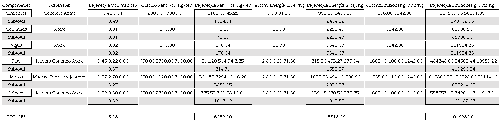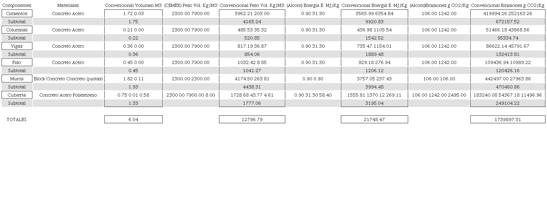 Finalmente, con base en la elaboración de tablas, en Microsoft Excel, se expresaron y compararon los resultados de los volúmenes, pesos, energía incorporada y emisiones de dióxido de carbono, de los materiales consumidos en los componentes de cada sistema constructivo analizado.