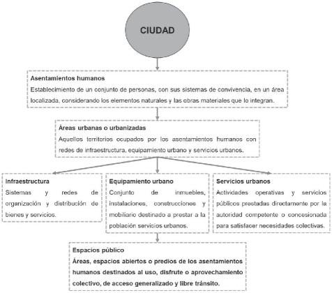 Esta investigación se enfoca en el espacio público que forma parte del equipamiento de un área urbana. Por lo anterior, haremos uso de un diagrama (ver figura 1) para explicar algunos conceptos relacionados, los cuales son desglosados hasta concluir con la definición de espacio público.