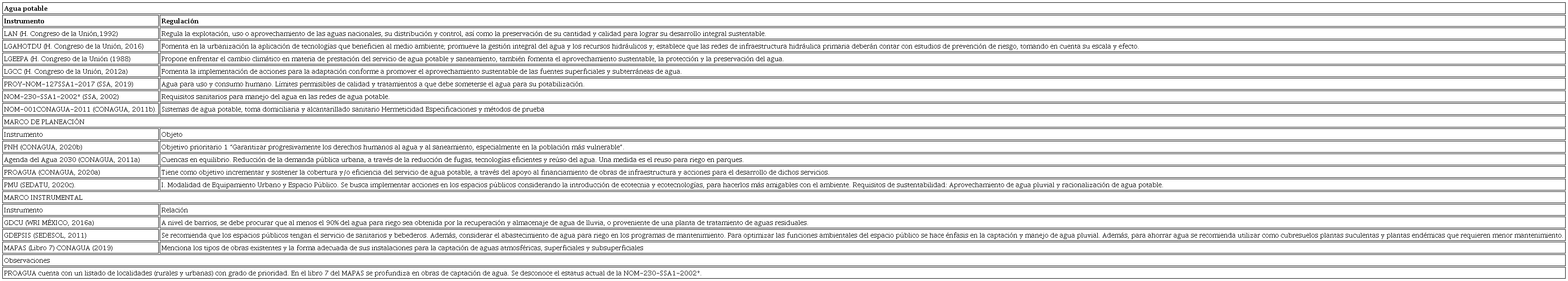 Ningún instrumento legal aborda el tema a nivel espacio público, pero se guarda relación debido a que se fomenta un uso sustentable del agua. Además, se identificaron NOMs relacionadas con la calidad del agua potable y a las condiciones óptimas del sistema.