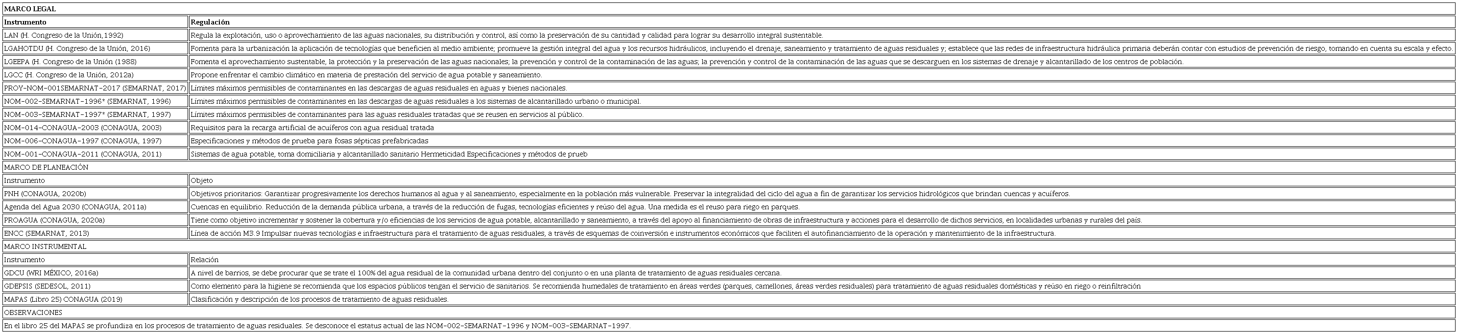 El marco instrumental está relacionado al uso eficiente y sustentable del agua. En este caso se identificaron actividades que requieren del suministro del agua en el espacio público, además se destaca a la captación de agua de lluvia como alternativa para optimizar funciones ambientales. También se mencionan los tipos de obras de captación.