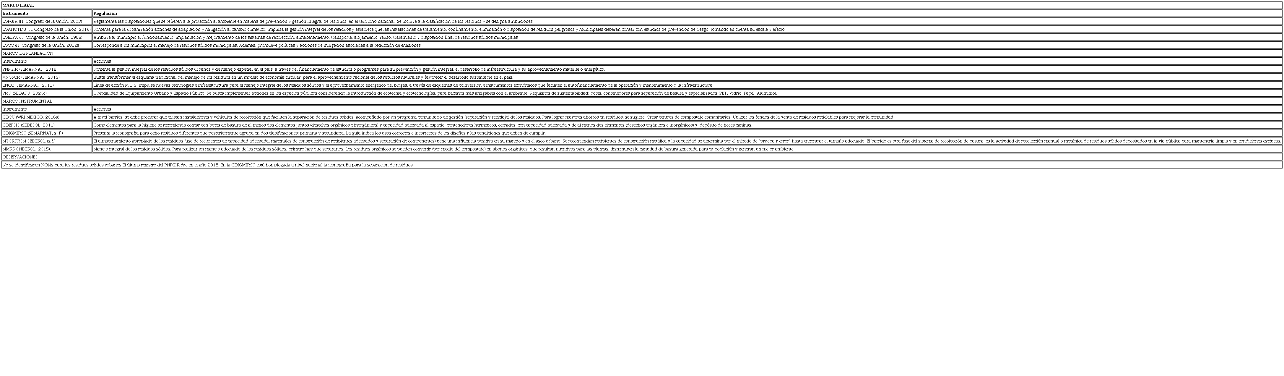 Ningún instrumento legal emite regulaciones en materia para el espacio público, pero se fomenta una gestión integral de los residuos y atribuye al municipio el manejo de residuos sólidos urbanos. Las NOMs identificadas no se consideran de interés debido a que se enfocan en los residuos peligrosos y de manejo especial.