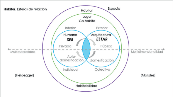 En la relación del ser interior y el estar exterior como la vinculación del espacio-tiempo que envuelve como ambiente, en el encuentro del interior y el exterior se presentan lo individual y lo colectivo como esferas relacionales en el proceso de habitar como acto poiético; donde lo individual surge como proceso de construcción personal y lo colectivo como proceso de co-construcción.