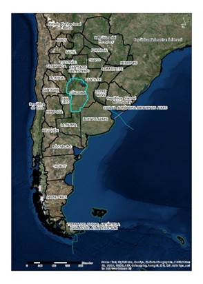 Figura 1. Imagen satelital de la República Argentina destacando la provincia de Córdoba.