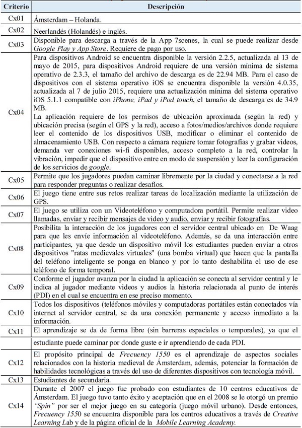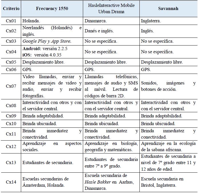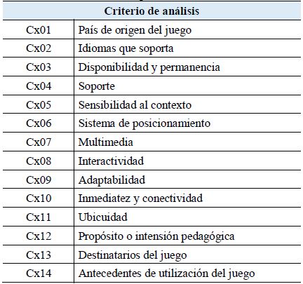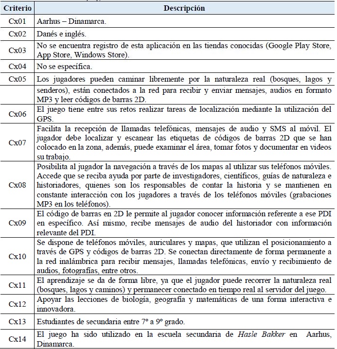 Para realizar el análisis de los juegos (aplicaciones) móviles educativas basadas en posicionamiento que han sido utilizadas en procesos formativos, se ha tomado como criterios de análisis las características que se abordaron y describieron con detalle en la sección 2.3, correspondiente al apartado del marco teórico. También, se consideró pertinente agregar otros criterios a nivel pedagógico que permiten ampliar aún más el contexto de utilización de los juegos por analizar, tales como: