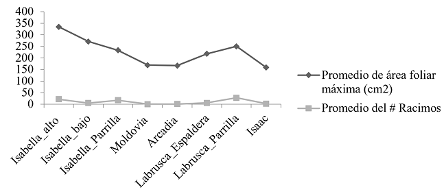 Para el análisis de datos se calcularon los valores de racimos promedio, área foliar máxima promedio y largo en espaldera (o ancho a la altura del pecho), para cada muestra por variedad. Además, se obtuvo un valor corregido de número promedio de frutos eliminando la ausencia para comparar con los resultados obtenidos, esto teniendo en cuenta que no todas las plantas están en las mismas etapas de desarrollo y especialmente en variedades menos comunes. Posteriormente, se realizaron pruebas de correlación entre el número de racimos tanto para con el área foliar máxima estimada como para con la variable de crecimiento (según el caso). En las variedades de Isabella y Labrusca americana se compararon los resultados con la misma variedad en condiciones distintas de altura y siembra. Todas las mediciones se realizaron con una cinta métrica de 5 m de longitud. En el siguiente apartado se presentan los resultados que permiten verificar el objetivo principal del estudio que antecede a este artículo, que es evaluar la productividad de las cinco principales variedades de la Finca El Espavey en sus condiciones respectivas de cultivo.