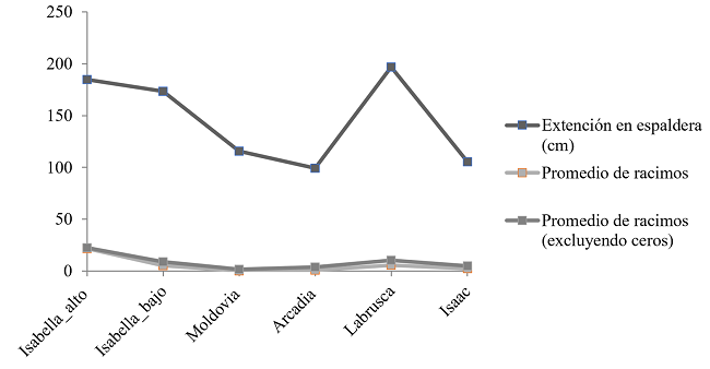 En cuanto a producción medida en número de racimos, los mejores resultados se obtuvieron en las variedades Isabella, en condiciones de espaldera (en Alto Espavey) y en parrilla, así como en Labrusca americana con cantidades promedio superiores a los 17 racimos. En contraparte, los resultados menos favorables fueron para las variedades Moldovia y Arcadia con 0.13 y 0.93 individuos en promedio respectivamente, esto se mantiene incluso al eliminar las plantas con cero producciones del promedio (ver Tabla 1 más adelante).