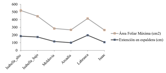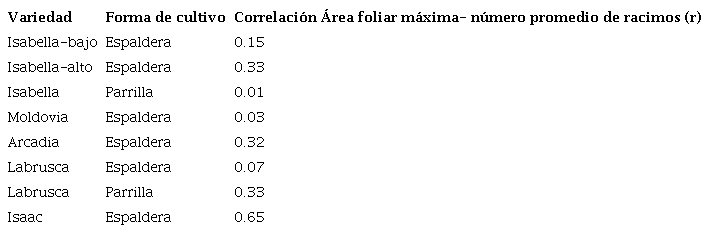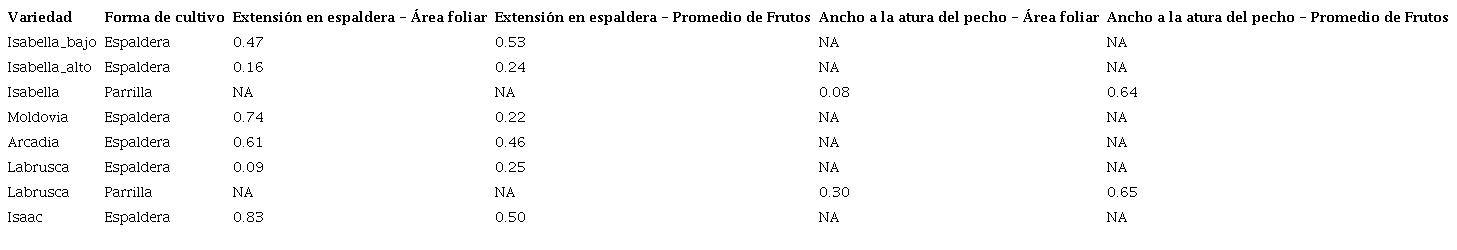En lo que respecta al área foliar máxima en función a la forma de cultivo, también se obtienen correlaciones importantes en espaldera para Isabella en el bajo Espavey (r=0.47), Moldovia (r=0.74), Arcadia (r=0.61) e Isaac (r=0.83), aunque no hay correlaciones relevantes con ancho a la altura del pecho (Tabla 3; Figura 3 más adelante).