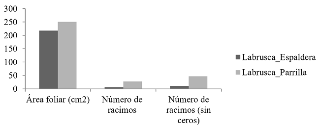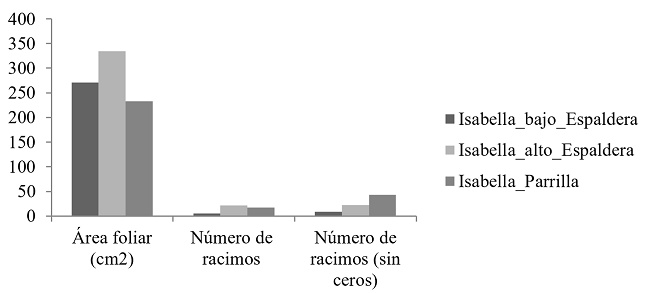 La Figura 6 permite observar un aparente mayor beneficio de sembrar en espaldera que en parrilla para Isabella, en cuanto a número de racimos y área foliar máxima. Se debe tomar en cuenta que la técnica de cultivo en espaldera tiene ciertas ventajas a nivel agronómico: posible cosecha nocturna para evitar la oxidación y mantener el aroma, posibilidad de injertar más plantas en el mismo terreno (más de 500 cepas por hectárea) y facilidad en la movilidad entre parcelas o calles optimizando la cosecha. Además, de una mejor eficiencia de los tratamientos sanitarios por lo que se reducen los riesgos de padecer enfermedades relacionadas con el exceso de humedad como el mildiú. Finalmente, puede haber una mejor maduración de la uva al recibir mayor cantidad de rayos solares, entre otros (Sánchez et al., 1999). Si estas ventajas fueron concebidas en comparación a la siembra en vaso, algunas se pueden extrapolar a la parrilla como la facilidad de manipulación, cosecha y cuidados.