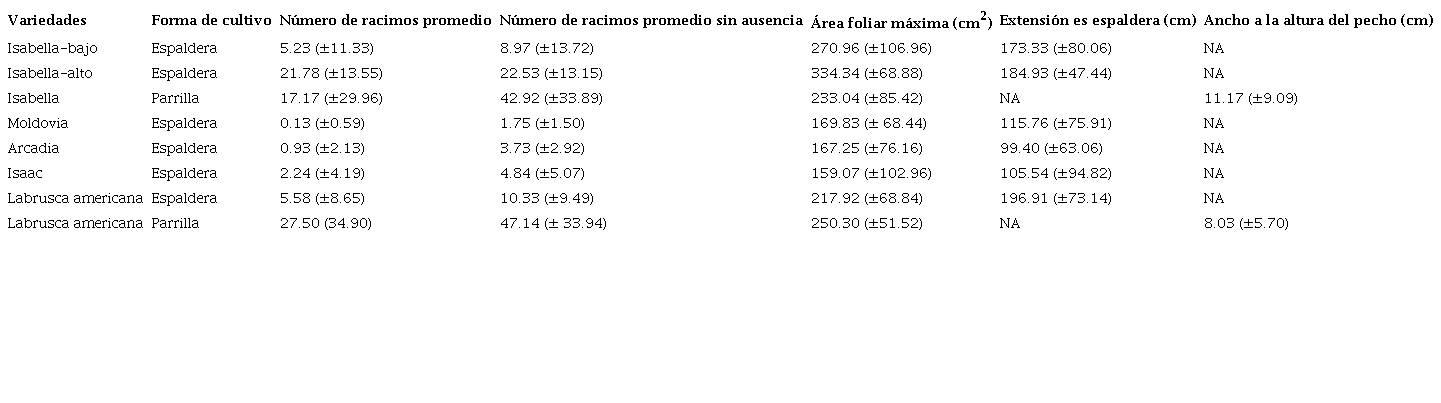 En cuanto a las variables de distancia en espaldera y ancho a la altura del pecho, parecen tener un mayor efecto sobre la productividad en término de racimos, ya que las correlaciones son mayores, principalmente en las variedades en espaldera de Isabella bajo Espavey (r=0.53), Arcadia (r=0.46) e Isaac (r=0.50) y las variedades en parrilla de Isabella (r=0.64) y Labrusca (r=0.65) (Tabla 3; Figura 2 más adelante).