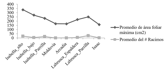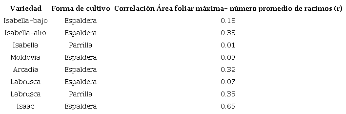 Al correlacionar las variables en función al número de racimos, se observó que no parece existir mayor correlación entre el número de racimos con el área foliar máxima, donde la única variedad con un resultado importante fue Isaac (r=0.65) y algunos indicios en Isabella en espaldera del Alto Espavey y en Moldovia (ver Tabla 2 y Figura 1 más adelante).