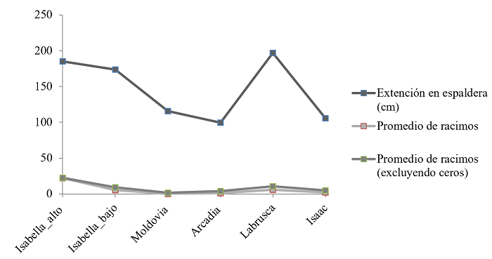 En cuanto a producción medida en número de racimos, los mejores resultados se obtuvieron en las variedades Isabella, en condiciones de espaldera (en Alto Espavey) y en parrilla, así como en Labrusca americana con cantidades promedio superiores a los 17 racimos. En contraparte, los resultados menos favorables fueron para las variedades Moldovia y Arcadia con 0.13 y 0.93 individuos en promedio respectivamente, esto se mantiene incluso al eliminar las plantas con cero producciones del promedio (ver Tabla 1 más adelante).