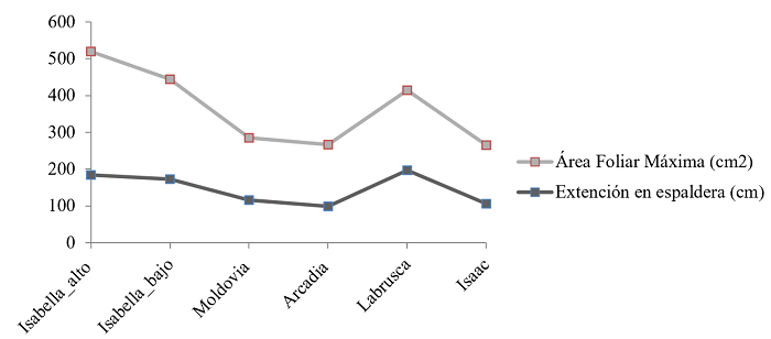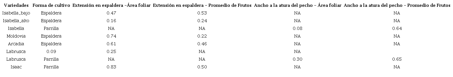 En lo que respecta al área foliar máxima en función a la forma de cultivo, también se obtienen correlaciones importantes en espaldera para Isabella en el bajo Espavey (r=0.47), Moldovia (r=0.74), Arcadia (r=0.61) e Isaac (r=0.83), aunque no hay correlaciones relevantes con ancho a la altura del pecho (Tabla 3; Figura 3 más adelante).