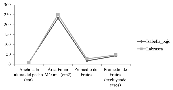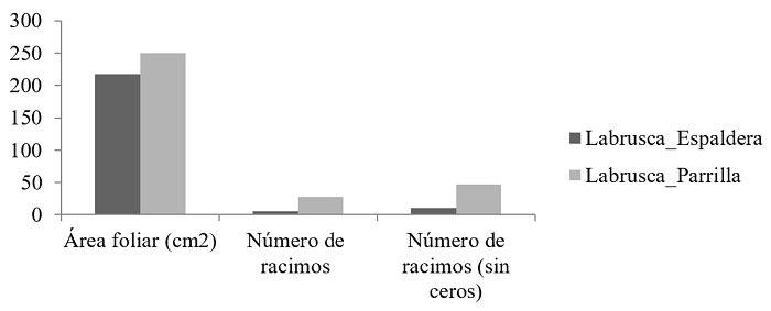 La figura 6 permite observar un aparente mayor beneficio de sembrar en espaldera que en parrilla para Isabella, en cuanto a número de racimos y área foliar máxima. Se debe tomar en cuenta que la técnica de cultivo en espaldera tiene ciertas ventajas a nivel agronómico: posible cosecha nocturna para evitar la oxidación y mantener el aroma, posibilidad de injertar más plantas en el mismo terreno (más de 500 cepas por hectárea) y facilidad en la movilidad entre parcelas o calles optimizando la cosecha. Además, de una mejor eficiencia de los tratamientos sanitarios por lo que se reducen los riesgos de padecer enfermedades relacionadas con el exceso de humedad como el mildiú. Finalmente, puede haber una mejor maduración de la uva al recibir mayor cantidad de rayos solares, entre otros (Sánchez et al., 1999)[29]. Si estas ventajas fueron concebidas en comparación a la siembra en vaso, algunas se pueden extrapolar a la parrilla como la facilidad de manipulación, cosecha y cuidados.