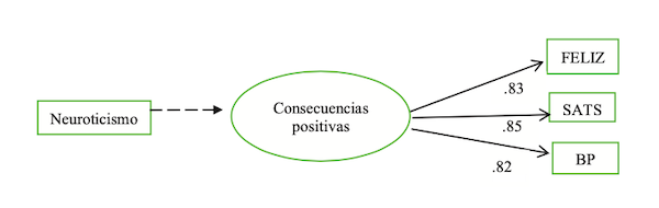 Al analizar las posibles influencias moderadoras de los rasgos de personalidad se obtuvieron resultados que no respaldaban las hipótesis de investigación. De acuerdo con la figura 3, la CS se asocia alta (β = .60) y significativamente (p <.05) con las consecuencias psicológicas positivas, en tanto, la figura 4 muestra un coeficiente estructural positivo y significativo de β =.33 (p<.05) que parte del neuroticismo hacia la CS. Esta última variable no se asoció significativamente con las consecuencias psicológicas positivas (figura 5).