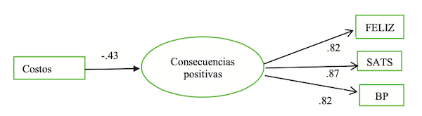 Un panorama distinto surgió del análisis del rol mediador/moderador de la variable costos conductuales. Como se expuso anteriormente, y se observa en la figura 3, la CS influyó notoria (β = .60) y significativamente (p<.05) en las consecuencias positivas de esa conducta, en ausencia de cualquier variable de prueba, incluyendo la variable costos conductuales. No se encontró lo mismo para la relación entre las CS y los costos conductuales, la cual resultó no significativa (ver figura 6). Los costos, sin embargo, tuvieron un efecto directo moderado y significativo (β = .43, p<.05) en las consecuencias psicológicas positivas (ver figura 7). Cuando se integraron las tres variables, los resultados anteriores se vieron alterados en el modelo final, como lo muestra la figura 8. Dado que tanto la asociación directa (β = .43, p<.05) como la relación mediada (β = -.36, β = -.27, p <.05) son significativas en este modelo, además de que el valor de la relación directa decrece de manera notoria (de β = .60 a β = .43) de cuando la variable de prueba estaba ausente a cuando se introdujo en el modelo, se concluye que los costos conductuales influyen en la relación CS-consecuencias positivas. Esta influencia es híbrida, es decir, tanto mediadora como moderadora.