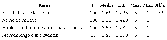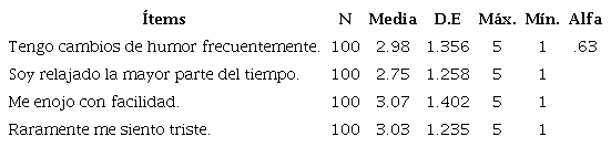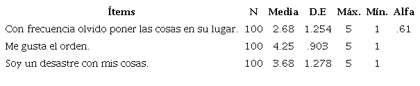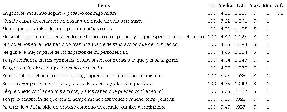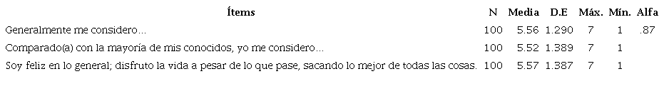 Con el fin de medir las consecuencias psicológicas positivas se emplearon escalas que miden felicidad, bienestar psicológico y satisfacción: La escala de Felicidad (Lyubomirsky, y Lepper, 1999) mide de manera global el bienestar subjetivo. Consta de 3 ítems con respuesta tipo Likert del 0 (nada feliz) al 7 (muy feliz). La escala de Bienestar Psicológico (Ryff, 1989), de la que se retomaron 13 ítems indicando autoaceptación, crecimiento personal y propósito con la vida, con un formato de respuesta del 1= totalmente en desacuerdo al 6= totalmente de acuerdo. La Escala de Satisfacción (Diener, Emmons, Larsen y Griffin, 1985) consta de cinco ítems que evalúan la satisfacción con la vida, e incluye reactivos como “estoy satisfecho con mi vida”, “si pudiera vivir mi vida otra vez, no cambiaría casi nada”, entre otros; el formato de respuesta es de tipo Likert, que va de 1= muy en desacuerdo hasta 5= muy de acuerdo. Se utilizó también la escala de los 5 Grandes Factores de Personalidad (Goldberg, 1999), adaptada y traducida para esta investigación (Donnellan,. Oswald, Baird., y Lucas, 2006). La escala es una versión reducida que consta de 20 ítems para medir los cinco rasgos de personalidad (Amabilidad, Responsabilidad, Apertura a nuevas experiencias, Neuroticismo y Extraversión) con un modo de respuesta de escala Likert donde 1= fuertemente en desacuerdo hasta 5= fuertemente de acuerdo.