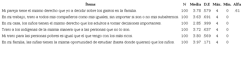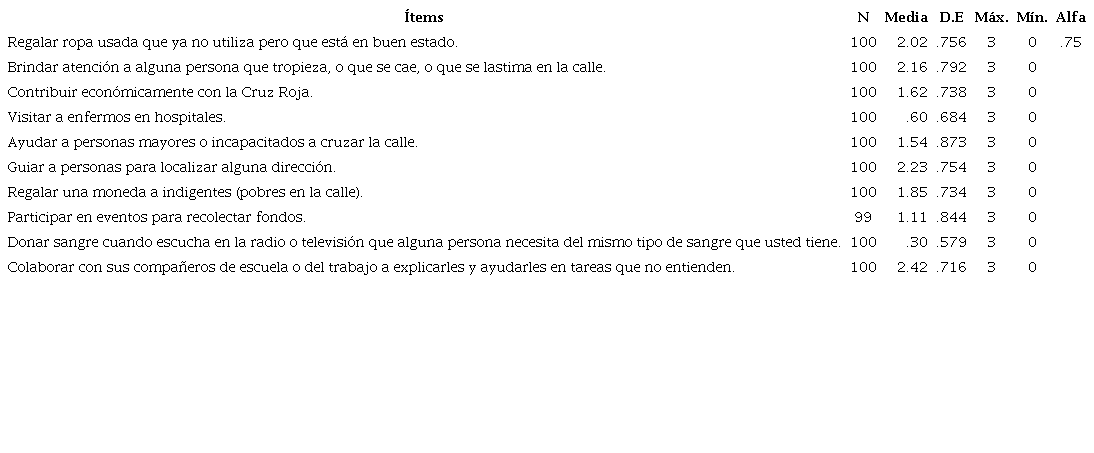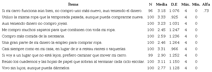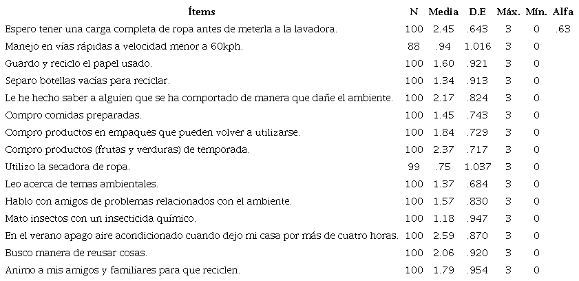 Se administró un cuestionario que mide el reporte de CS (proecológicas, frugales, altruistas y equitativas: Tapia, Corral, Fraijo y Durón, 2013). La escala de Conducta Proecológica recoge el reporte de acciones de protección de la naturaleza como cuidar el agua, ahorrar energía y reciclar, entre otras, en una escala de respuesta que va del 0= nunca a 3= 0 siempre. La conducta frugal se midió con un instrumento que informa sobre conductas de evitación de desperdicio y derroche de recursos, como reusar productos y vivir sin lujos, el cual se responde en una escala del 0 al 4. El comportamiento altruista fue registrado por medio de una escala en la que se reportan acciones de ayuda desinteresada hacia otras personas, como regalar dinero a necesitados, donar sangre y visitar enfermos; la escala de respuesta va de 0= nunca a 3= siempre. Para medir la conducta equitativa se empleó un instrumento que recoge el informe de acciones de trato justo y no discriminatorio hacia otros, tales como tratar por igual a pobres y ricos, así como otorgar los mismos derechos a niñas y niños, entre otras, empleando una escala de respuesta del 0 al 4.