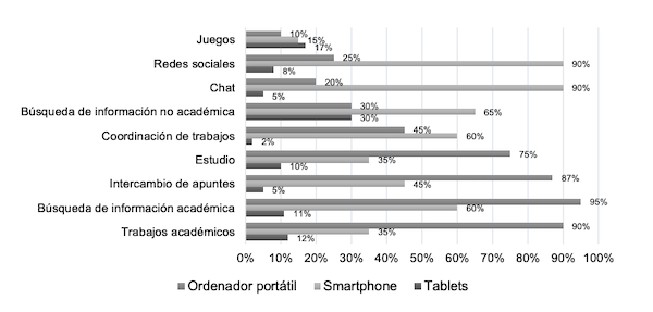 En ese sentido, el creciente uso de las TIC está dando lugar a que éstas formen parte de la vida cotidiana y académica, de ahí la importancia de incorporarlas en los procesos inclusivos. Los estudiantes indígenas utilizan con mayor frecuencia el smartphone para redes sociales, para intercambiar apuntes y para realizar trabajos grupales con compañeros; el ordenador portátil es más utilizado con fines académicos como la elaboración de trabajos y búsqueda de información; en menor medida se tiene el uso de la tableta, pues esta se usa para fines de ocio y diversión (Bernete, 2010; Sulmont, 2012).