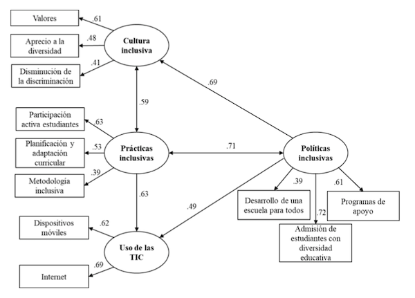 Finalmente, en la figura 3 se propone el siguiente modelo inclusivo por medio de ecuaciones estructurales; el factor principal fueron las Políticas inclusivas, dentro de este factor se muestran pesos estructurales mayores de .30, por ende, se encuentra validez convergente y significancia en los constructos que integran cada uno de los factores; se destaca la admisión de estudiantes diversos (peso estructural=.72), y programas de apoyo (.61). Se muestra una relación significativa bidireccional entre Políticas y Prácticas inclusivas con una covarianza de .71; también se determina que las políticas vuelven probables la cultura inclusiva (.69) y el uso de la TIC en el contexto educativo (.49). Por otro lado, las practicas inclusivas se relacionan bidireccionalmente con la cultura inclusiva (.59); y estas a su vez se relacionan significativamente en el uso de la TIC (.63).