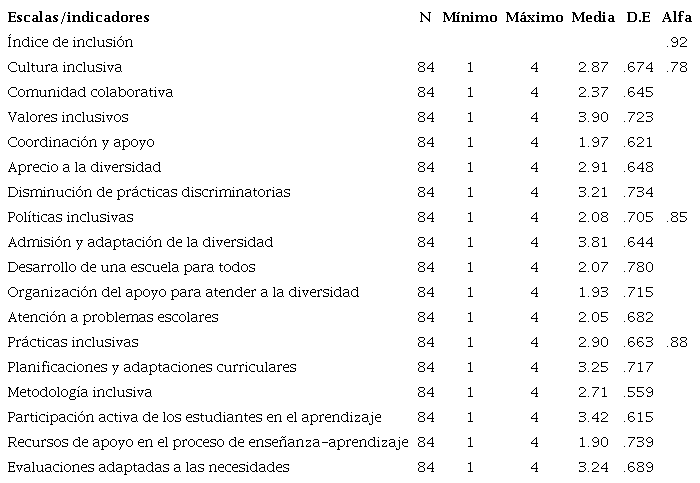 La tabla 1 muestra los valores mínimos y máximos de los reactivos, las medias, la desviación estándar y el alfa de Cronbach de las escalas del índice de inclusión. Como se observa, los valores de alfa son mayores de .60, por lo cual se consideran aceptables y fiables.