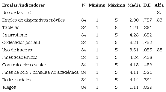 2) Cuestionario de dispositivos móviles en educación. El aprendizaje ubicuo de Sevillano y de Vázquez (2015) se adaptó para el estudio. Una parte de este cuestionario se compone por 24 ítems distribuidos en tres macrocategorías correspondientes a tres dispositivos digitales: tableta, smartphone y ordenador portátil; el tipo de escala de respuesta es Likert (1 nada/5 mucho) sobre el uso académico y social con referencia a los siguientes ítems: elaboración de trabajos académicos, búsqueda de información académica, estudio, intercambio de apuntes, coordinación de trabajos grupales con compañeros, consulta de servicios universitarios, búsqueda de información no académica, chat y mensajería instantánea, correo electrónico y redes sociales. El coeficiente de Alfa de Cronbach fue .87.