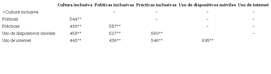 Lo que respecta a las correlaciones de Pearson, los resultados muestran que las son significativas a un nivel de 0.01 (bilateral). Por lo cual se pude decir que existe una relación altamente significativa entre políticas inclusivas, cultura (.544**), prácticas inclusivas (.587**) y uso de dispositivos móviles (.527**), así como prácticas inclusivas con el uso de dispositivos móviles (.560**) y uso de internet (.546**); y altamente se correlaciona el uso de dispositivos móviles con el uso de internet (.695**), en la tabla 3 se muestran los resultados.