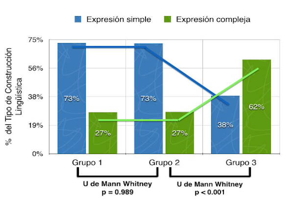 Los datos de construcción simple y compleja se analizaron estadísticamente. Se empleó la prueba U de Mann Whitney para comparar al grupo 1 con el 2 y luego al grupo 2 con el 3. Los resultados mostraron que no existe diferencia significativa entre el grupo 1 y el 2 (p= 0.989). Esta misma prueba arrojó que sí existe diferencia significativa entre los grupos 2 y 3 (p < 0.001).