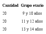 Se trabajó con diez niñas y diez niños por cada grupo etario. El grupo etario es una manera de apelar a los factores de desarrollo de la inteligencia como la madurez (edad), la transmisión social (como el conocimiento de diversos sistemas semióticos y sistemas de conocimiento culturalmente acuñados) y la experiencia (tanto física como lógico-matemática) (Piaget, 1989).