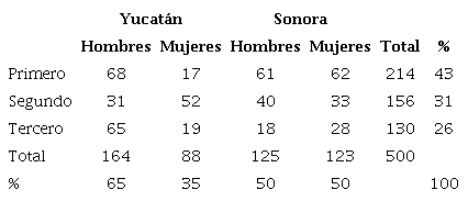 Los participantes fueron estudiantes de bachillerato de los estados de Sonora, en el noroeste, y Yucatán, en el sureste de México, específicamente de las ciudades de Ciudad Obregón y Mérida. En Sonora se recolectaron datos de 248 alumnos (49.6%) y en Mérida, de 252 (50.4%). La tabla 1 describe a los estudiantes de la muestra por grado.