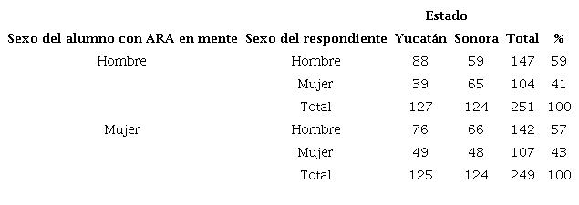 Con el objetivo de analizar diferencias en la percepción del alumno con ARA en relación con el sexo, se diseñaron y administraron dos versiones del instrumento con exactamente los mismos reactivos, pero con sus respectivas flexiones en masculino y femenino. La tabla 2 muestra la relación de los participantes por sexo y el sexo predeterminado por los investigadores del alumno con ARA.