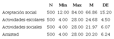 De manera general, los estudiantes reportaron una media de 66.86 (DE= 15.20) en aceptación social de los alumnos con ARA, considerando que los puntajes en la escala total iban de 12 a 84, lo anterior refleja una aceptación social alta de los alumnos con ARA por parte de sus compañeros. En las dimensiones de Aceptación social, la media más alta se presentó en Actividades escolares (24.68), seguido de las Actividades sociales (21.97) y finalmente Amistad (20.20), dado que los puntajes de cada dimensión iban de 4 a 28, lo anterior podría indicar que existe una aceptación social hacia los alumnos con ARA; no obstante, ésta es mayor en las actividades escolares y en menor grado en amistad de alumnos con ARA.