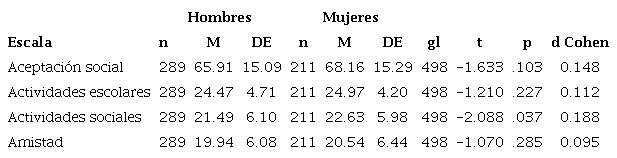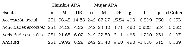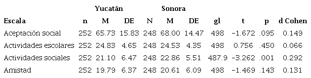 Respecto a las comparaciones de grupo, se realizó el análisis por región o estado confrontando los resultados y se observó diferencia significativa en la dimensión de actividades sociales, donde los estudiantes del estado de Sonora obtuvieron puntajes más elevados (t = -3.262, p = .001) en aceptación social de los alumnos con ARA que los alumnos de Yucatán, y la magnitud de la diferencia fue moderada (d= .29).
