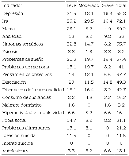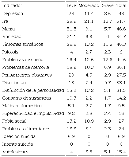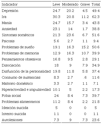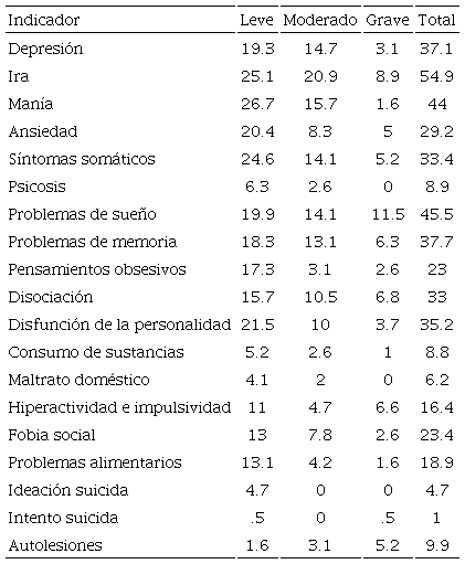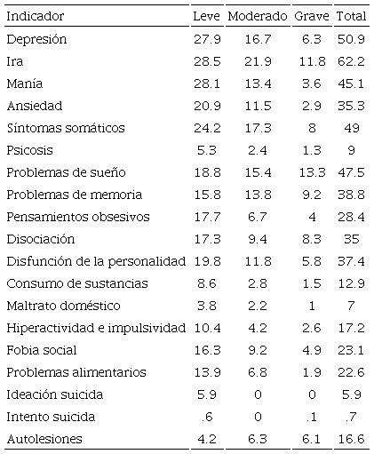 Los resultados concuerdan con lo encontrado en investigaciones anteriores en ciertos indicadores como lo son los problemas de regulación e inestabilidad emocional (Pozos et al., 2014), problemas del estado de ánimo como depresión (Gallagher, 2014; Lester, 2014; Lipson et al. 2015), problemas de sueño (Valerio et al., 2016), así como de conductas autodestructivas como lo son los comportamientos suicidas (Lester, 2014; Lipson et al., 2015). En otros indicadores se encontró una baja en prevalencia, como lo es el indicador de ansiedad, referido en algunas investigaciones (Micin y Bagladi, 2011), lo cual resultó no ser tan significativo en comparación con otros. Indicadores como lo son la somatización, manía, disociación y la disfunción de la personalidad, y problemas de memoria presentan poca evidencia empírica, por lo que constituye un área de oportunidad para seguir investigando.
