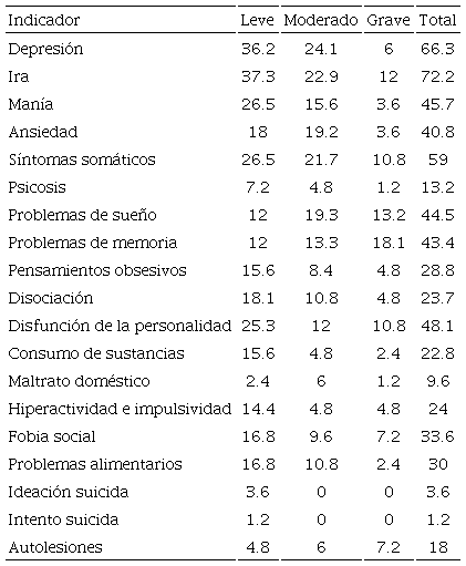 El panorama se modifica al observar a nivel de grados; en el grado leve, el indicador de ira se presenta con mayor prevalencia, seguido por el indicador de manía, y en tercero por el indicador depresivo, lo cual hace pensar periodos de inestabilidad en los estudiantes, que oscilan entre altas y bajas en su estado de ánimo. En el grado moderado se presenta el indicador de ira con mayor prevalencia, seguido por el indicador de síntomas somáticos, y como tercero el indicador de depresión. Por último, el grado grave o severo se observa que son los indicadores de problemas de sueño los de mayor prevalencia, seguidos por el indicador de ira, y en tercero el indicador de problemas de memoria.